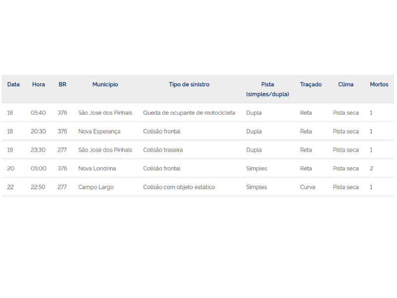 A Polícia Rodoviária Federal (PRF) no Paraná registrou 83 acidentes durante o feriado prolongado de Corpus Christi em 2025, o que representa uma redução de 16,2% em relação aos 99 acidentes contabilizados em 2024. Já o número de feridos passou de 81 em 2024 para 92 em 2025, alta de 13,6%. No entanto, o número de mortos subiu de 4 para 6, um aumento de 50% no período comparado. Das seis mortes, três foram registradas em colisões frontais.