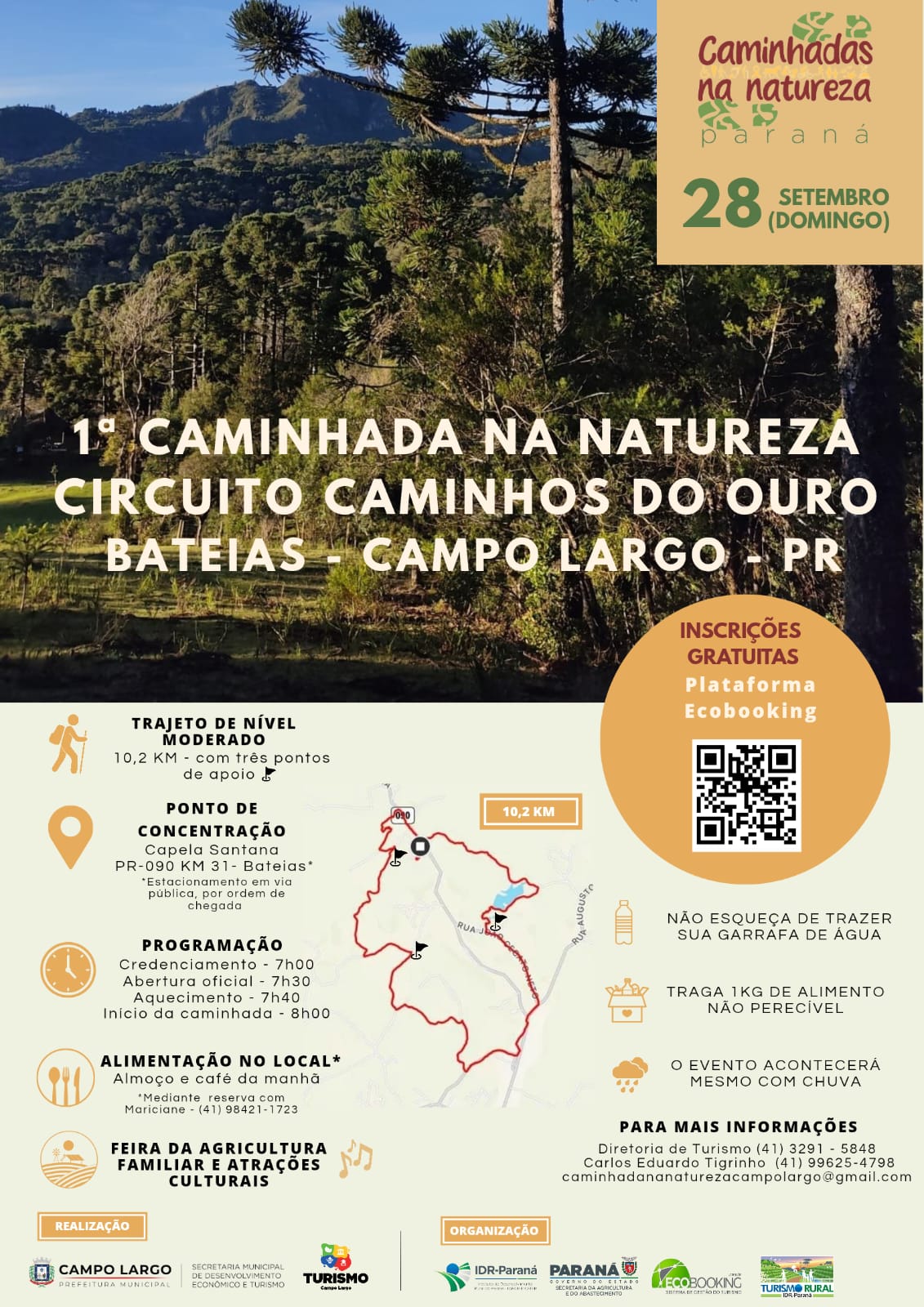 Campo Largo receberá no dia 28 de setembro a 1ª Caminhada na Natureza Circuito Caminhos do Ouro – Bateias, um evento que promoverá o ecoturismo e contato com a natureza em um percurso de 10,2 quilômetros, de nível moderado. O trajeto passa por estradas rurais, trilhas em meio à mata e áreas de plantio, oferecendo aos participantes a oportunidade de vivenciar de perto a paisagem característica da região. A caminhada acontecerá mesmo em caso de chuva e contará com pontos de apoio estruturados ao longo do percurso.