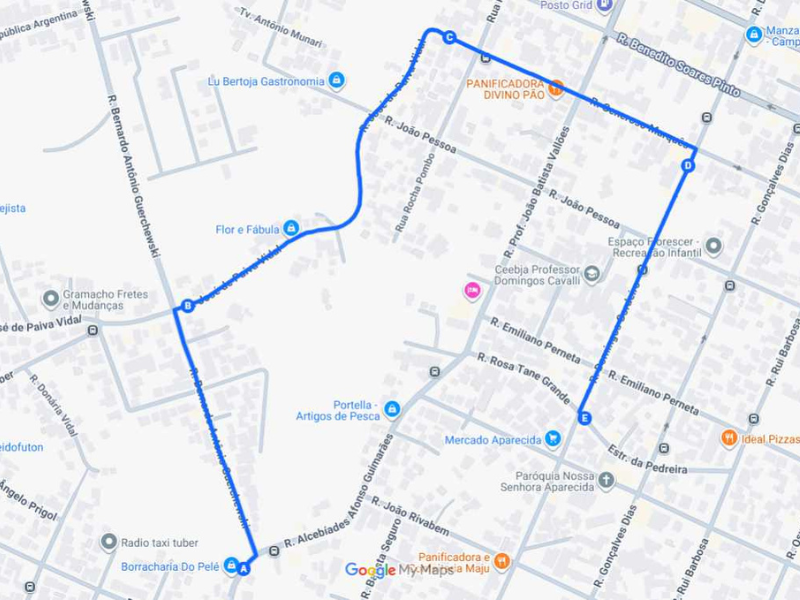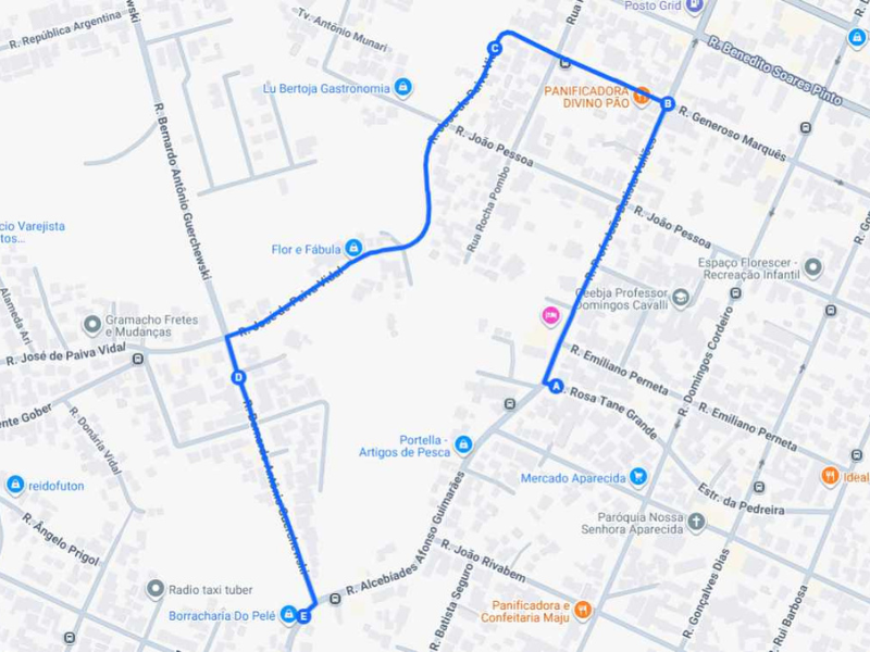 Volta: segue pela Rua Alcebíades Affonso Guimarães até a Rua Bernardo Antônio Guerchewski; vira à direita na Rua José de Paiva Vidal e segue até a Rua Generoso Marques; vira à direita na Rua Domingos Cordeiro, até a Rua Rosa Tane Grande, para retornar ao trajeto normal.
