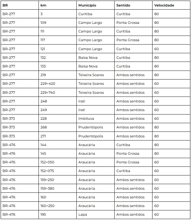 A fiscalização com equipamentos medidores de velocidade entra em vigor no Lote 1 das rodovias do Paraná, administradas pela Via Araucária, neste dia 27 de fevereiro. Ao todo são 24 radares em trechos que passam por Curitiba, Campo Largo, São Luiz do Purunã, Teixeira Soares, Irati, Imbituva, Prudentópolis, Araucária e Lapa. O limite de velocidade varia de acordo com as características de cada trecho.