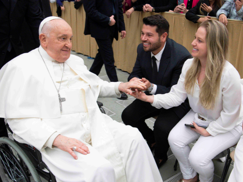 O casal Aline Robacker e Michael Portugal também teve a oportunidade de receber uma bênção especial do Papa Francisco durante uma viagem à Europa, porém, com um agendamento diferente, como Aline disse, “encaminhado por Deus”. “Eu casei com o meu marido em 22 de dezembro de 2023, no Santuário do Senhor Bom Jesus, e em janeiro viajamos para nossa lua de mel. Um dos destinos escolhidos foi Roma. Uma das minhas melhores amigas, Larissa, me passou o contato do cunhado dela, Tibério, que estava fazendo seminário em Roma e mandei uma mensagem para combinarmos de nos encontrar e ele nos acompanhar em algum passeio.”