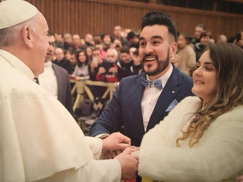 Luiza Drevniak Bedoya e César Bedoya tiveram a oportunidade de receber uma bênção especial do Papa Francisco pelo casamento em janeiro de 2017, no Vaticano, ao final da missa de Ano Novo. “É uma longa história. Nós tivemos que escrever uma carta para o Vaticano e dentre as cartas de casais de todo o mundo, contando suas histórias, eles escolhem quatro e mandam o convite. No dia tinha que ir com roupas de casamento, vestido branco e homens de terno. Porém, eles só avisam com três dias de antecedência. Não sabíamos se seríamos chamados ou não, então não comprei nada de casamento para a viagem. Eles avisaram dia 31 de dezembro e nós saímos correndo pra achar roupas para o evento com o Papa. Lembro que eu costurei a barra do meu vestido com agulha e fio do lençol do hotel”, relembra Luiza.
